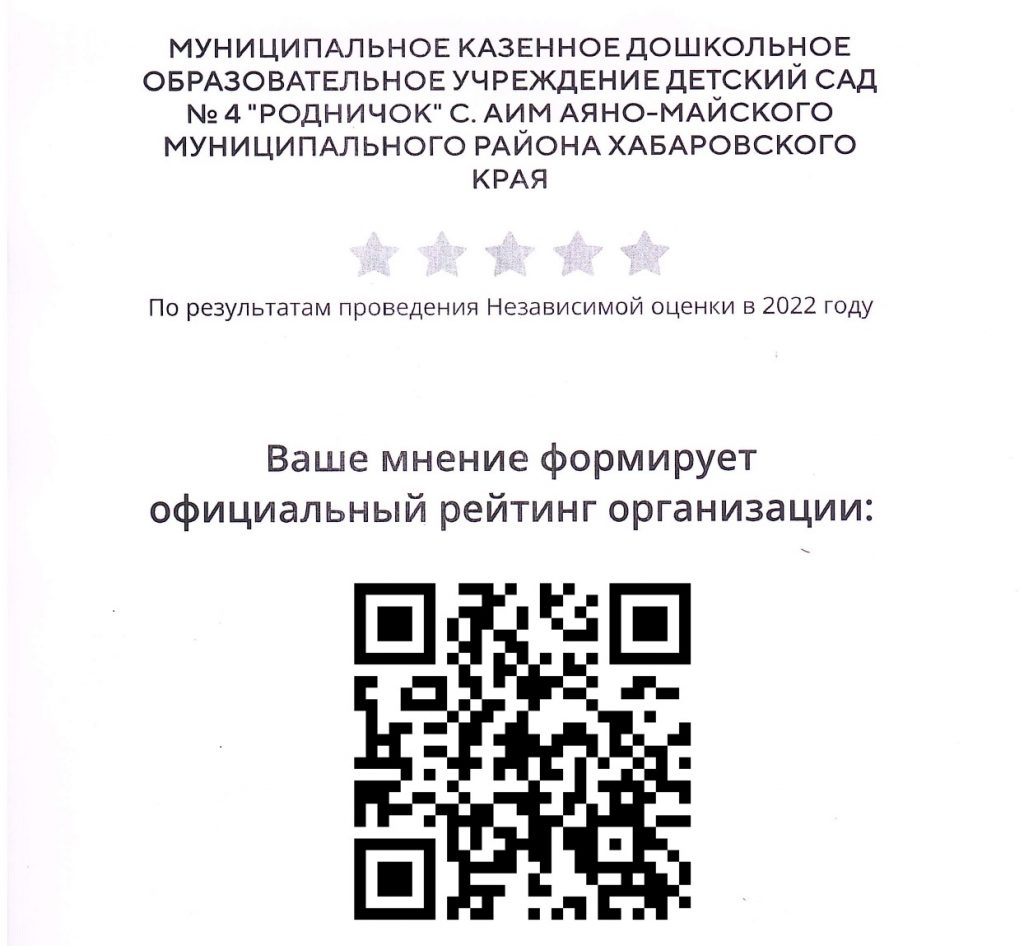 Полное наименование: Муниципальное казённое дошкольное образовательное учреждение детский сад №4 «Родничок» с. Аим Аяно-Майского муниципального района Хабаровского края